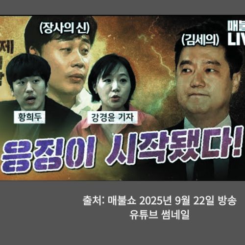 매불쇼는 심우정 특검 출석과 ‘검찰 행동대장’ 의혹, 통일교 11만 명 당원 명부 파장, 국민의힘 대구 집회와 오세훈 한강버스 稅 낭비 논란까지 심층 분석했습니다. 사장남천동은 원전 현수막 파문, 대선 불복 집회, 통일교 추가 유착, 이재명 대통령 UN총회 외교, 정용진·한동훈 등 보수권 인물 논란을 다뤘습니다.
